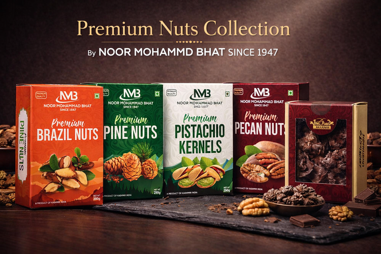 From the legacy of trust and taste established in 1947, Moor Mohd Bhat brings you a handpicked selection of the finest special nuts, sourced for superior quality, freshness, and rich natural flavor. Our premium assortment includes golden walnut kernels, aromatic pista kernels, crunchy hazelnuts, nutrient-rich Brazil nuts, delicately peeled pine nuts, indulgent chocolate walnuts, and buttery pecan nuts. Each nut is carefully selected and processed to preserve its purity, texture, and nutritional value. Perfect for daily nourishment, festive gifting, and gourmet creations, this exclusive collection reflects decades of craftsmanship, authenticity, and uncompromising quality.